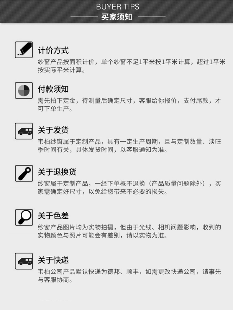 定制紗窗5扇以上(部分地區6扇以上),我們會提供免費上門安裝服務;拍下定金后,我們會在3日內上門測量,測量后線上付清尾款,10-15天左右上門安裝;下單后如需修改尺寸,收取一定的費用,產品報價均不含運費;定制型產品一旦下單生產,不接受質量以外的退款;本公司產品在天貓、京東均有官方旗艦店,請大家認準摩爾戴克品牌,謹防假冒;計價方式如下:寬度不超過1.1米,高度不超過1.5米,480元/扇,對開按照兩扇計費。